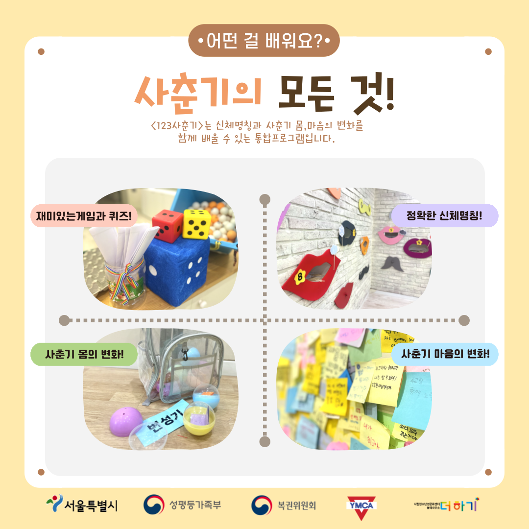 내용: 신체 명칭과 사춘기 몸 변화, 사춘기 마음의 변화를 함께 배울 수 있는 통합한 프로그램