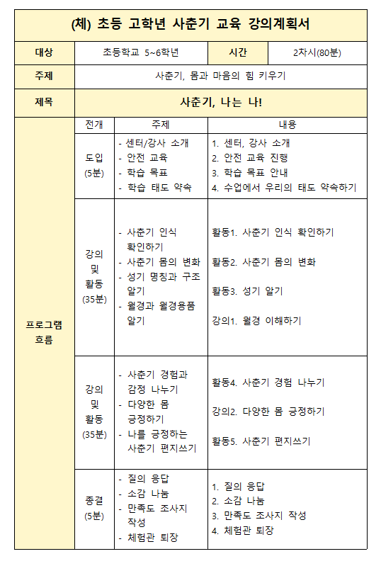 키워드 : 사춘기, 사춘기 몸의 변화, 신체 명칭, 성기 명칭, 월경, 성별고정관념, 몸 이미지 긍정하기, 나다운 나