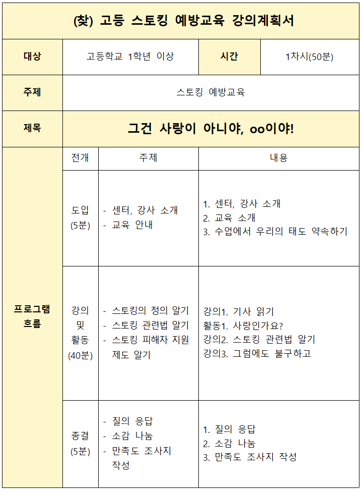 키워드 : 스토킹, 스토킹관련법, 관심, 배려, 존중, 통제, 예방교육