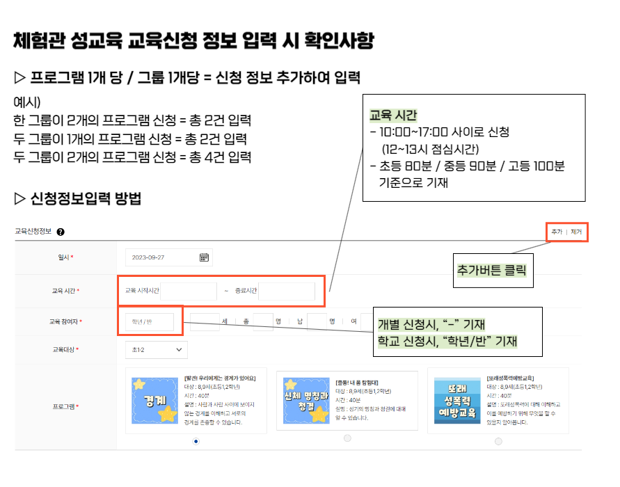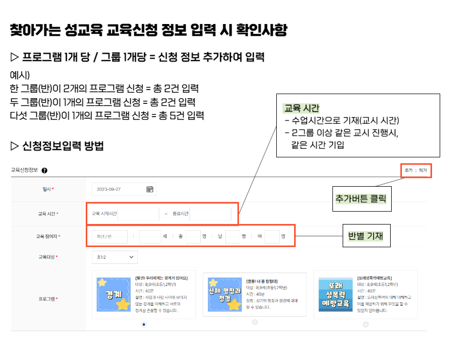 - 2개 그룹 이상 진행될 경우, 오른쪽 상단 "추가" 버튼을 눌러 반별 기입 부탁드립니다!(그룹별로 인원수가 필요합니다)